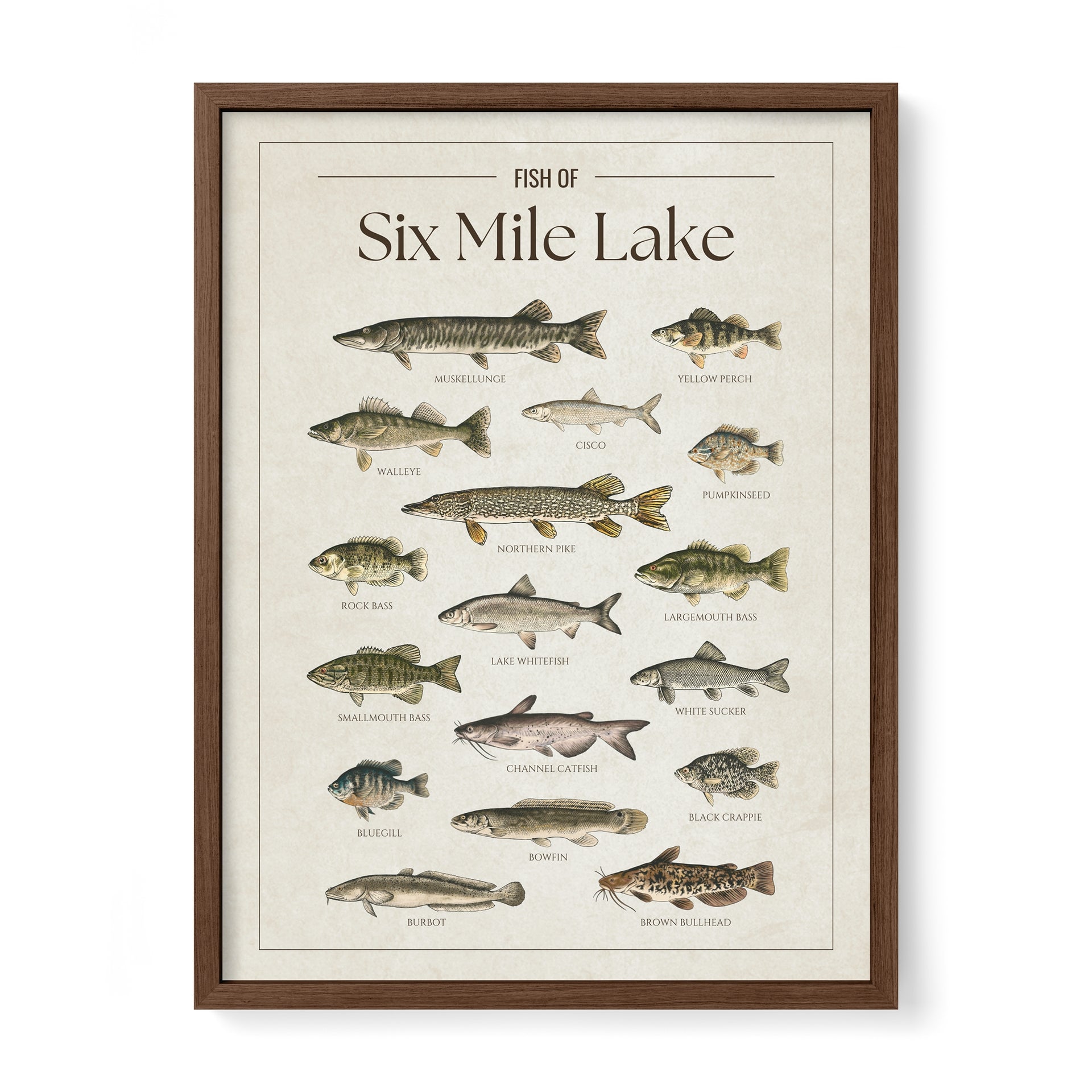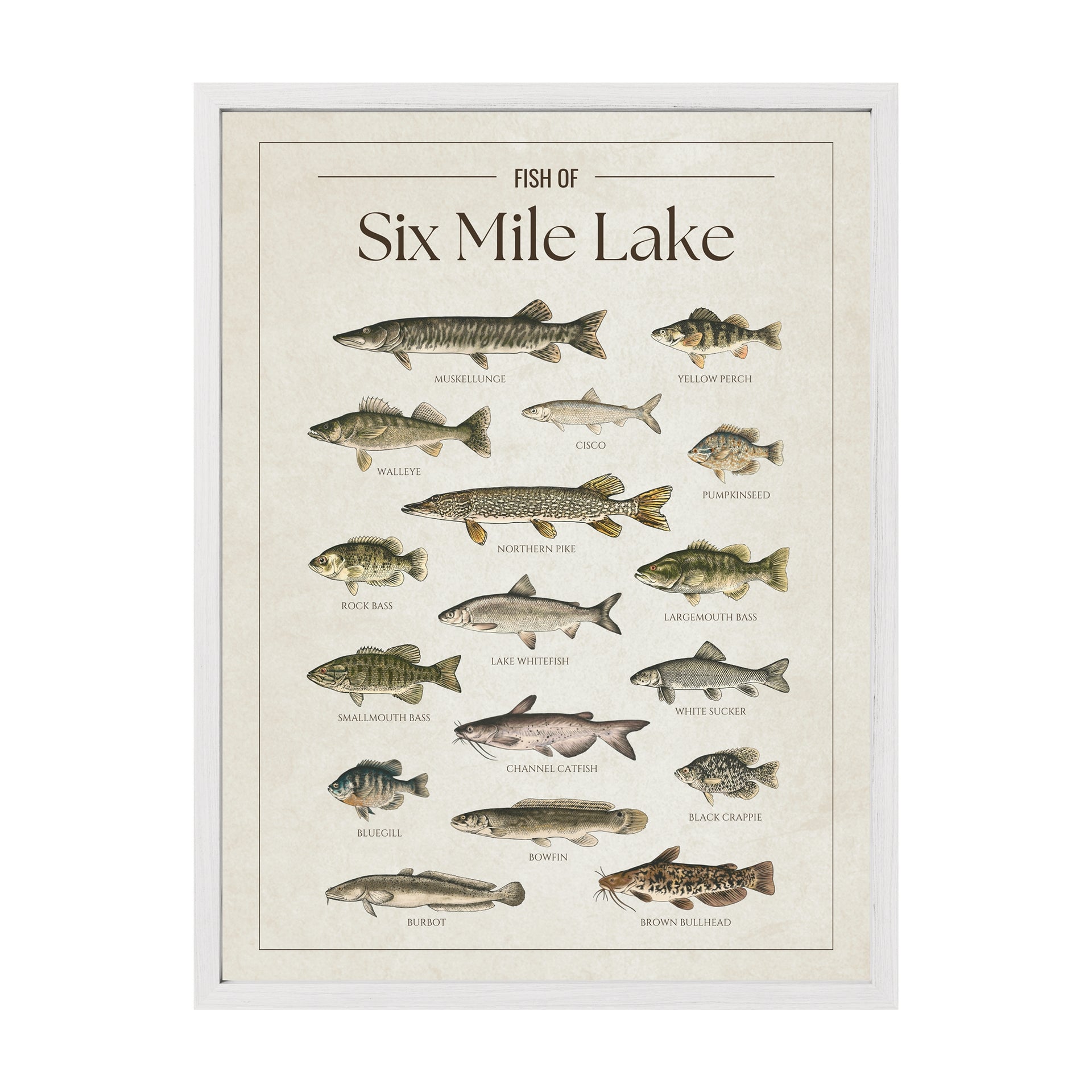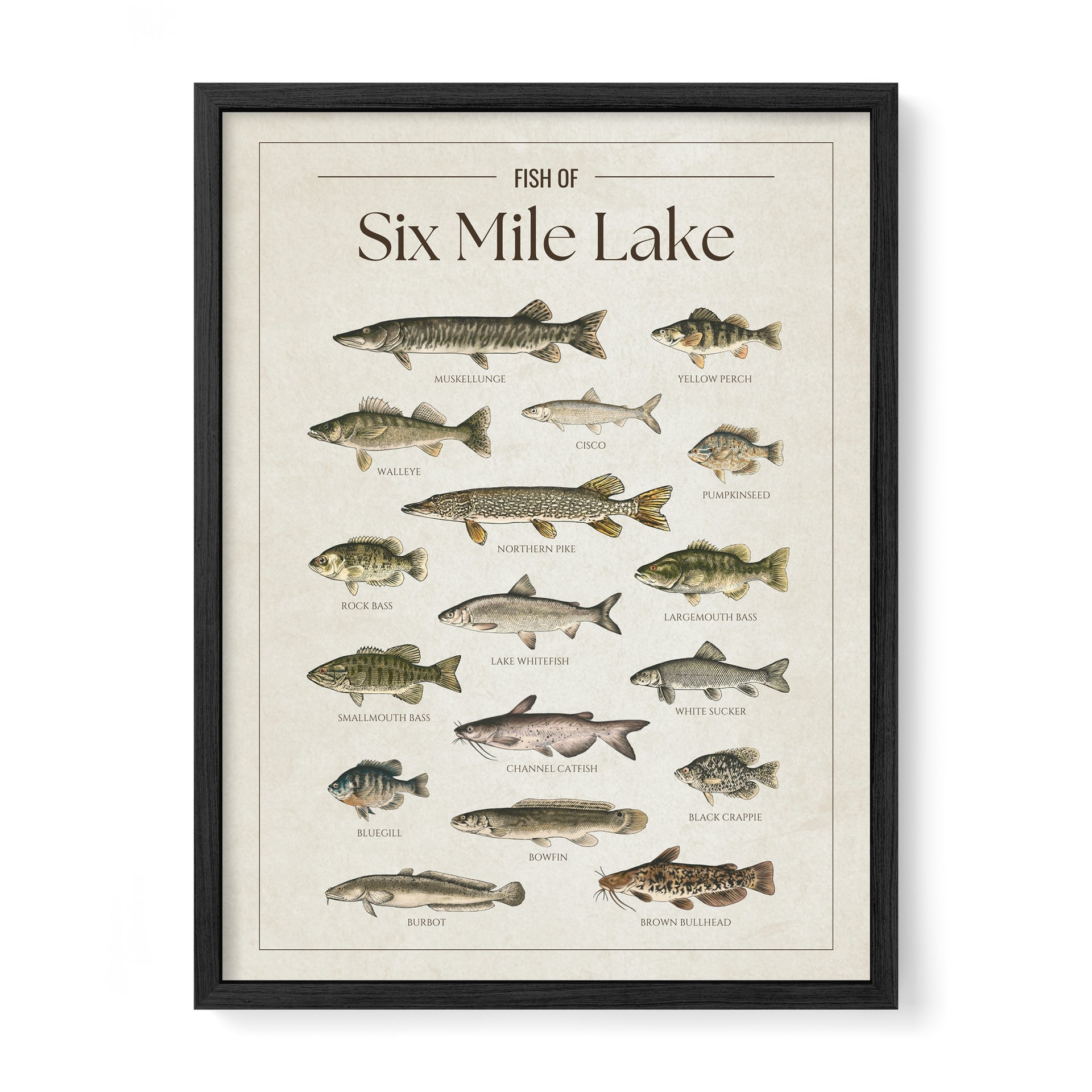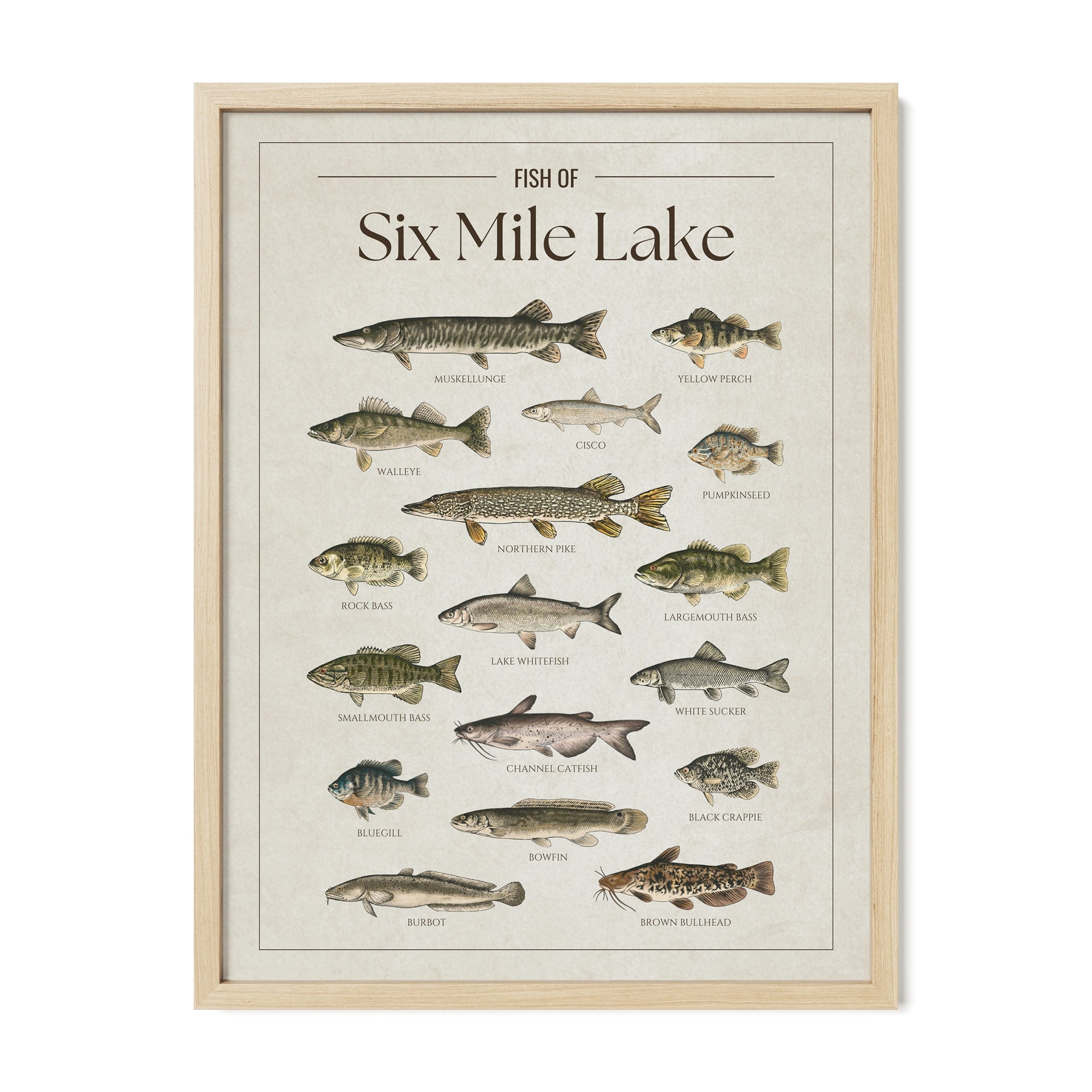 This Six Mile Lake fish chart is the perfect way to showcase your love for the lake. Whether you’re an angler, a cottage owner, or just enjoy the lake life, it’s a great addition to any space.
