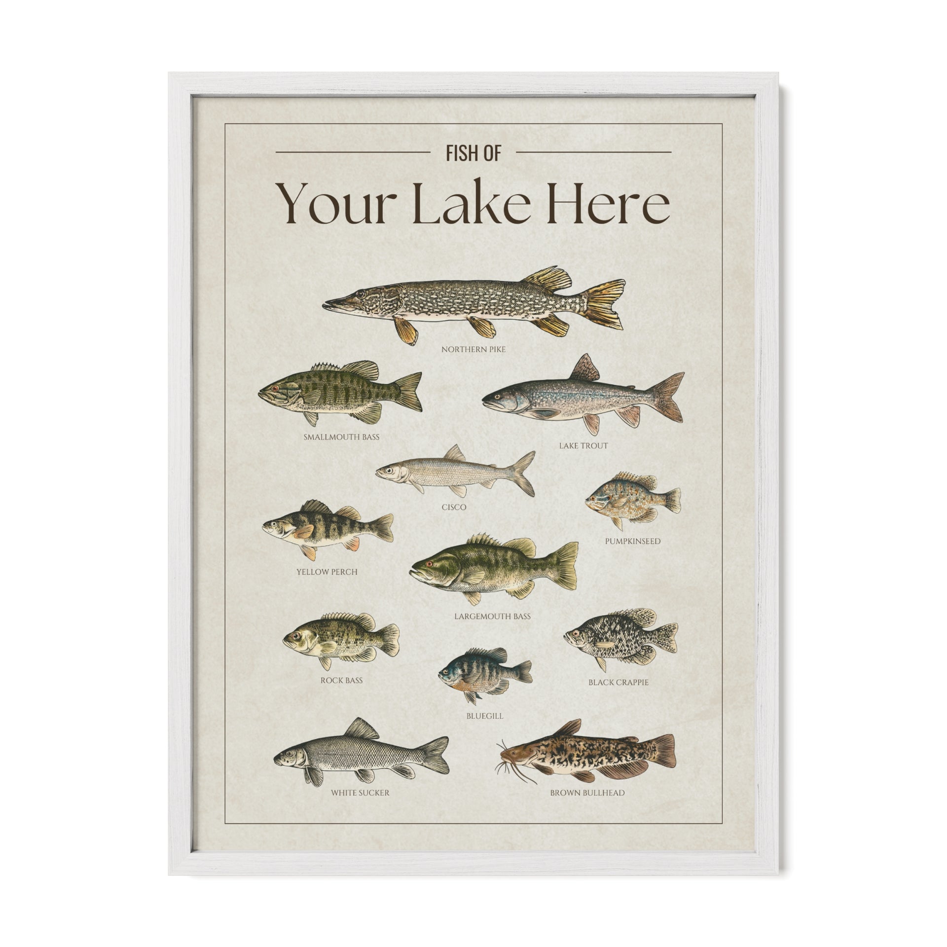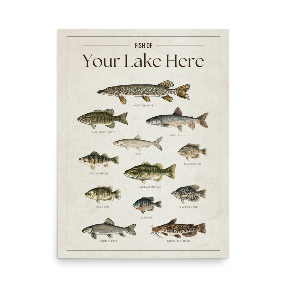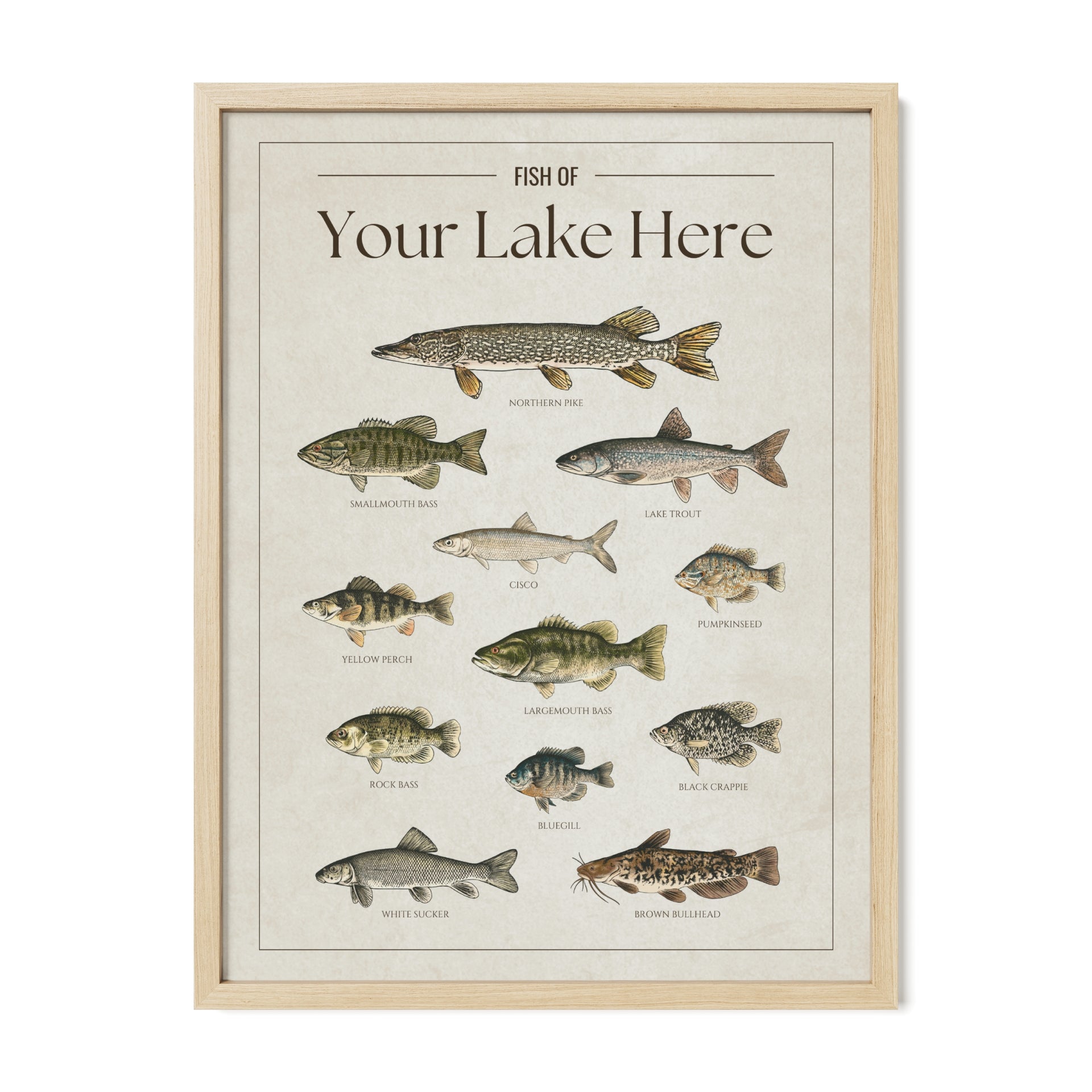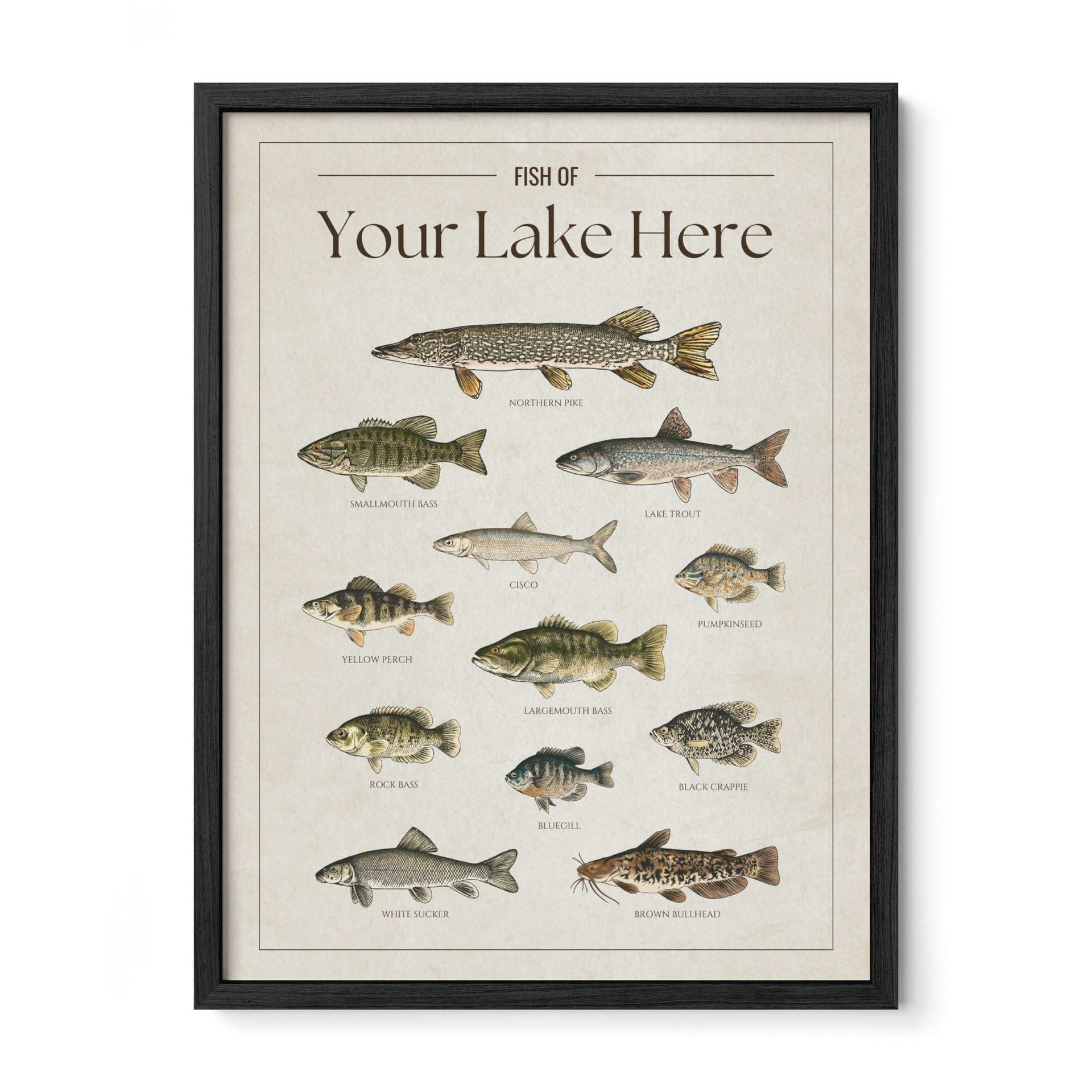 Our custom 18" × 24" matte Fish Print is created specifically for your lake, river, or favourite body of water — designed using verified species data and finished as a museum-quality print, with optional professional framing.